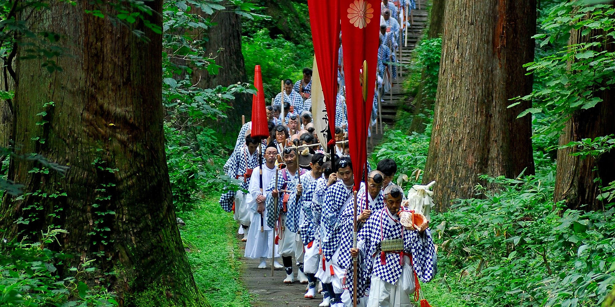 羽黒山は、月山、湯殿山と合わせて、「出羽三山」といわれています。「西の伊勢参り、東の奥参り」という言葉もあり、一生に一度は参拝するべき場所として有名です。羽黒山の参拝ルートは、随神門から山頂の三神合祭殿まで、約1.7km、片道1時間ほどです。随神門から山頂まで続く杉並木は、ミシュラン・グリーンガイド・ジャポンで三ツ星に選ばれています。朱塗りの「神橋」を過ぎるところには、樹齢1000年と言われる「爺杉」と、国宝の「五重塔」があります。五重塔の次は、2446段の石段にチャレンジ!鳥居をくぐれば、山頂です。たどり着いたときの達成感は感動的!出羽三山の神々を祀る「出羽神社 三神合祭殿」への参拝がゴールです。